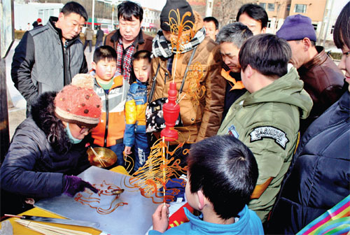 2 月23 日,中國非物質文化遺產——糖畫在原平市場亮相,現(xiàn)場加工制作的糖畫栩栩如生,讓在場的群眾一飽眼福。(趙春曉 攝)