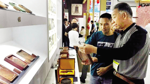 第十二屆中國(guó)(深圳)國(guó)際文化產(chǎn)業(yè)博覽交易會(huì)5月12日在深圳會(huì)展中心開幕。我市定襄縣晟龍木雕廠木雕、河邊雅藝軒澄泥仿古硯和繁峙縣晉繡坊刺繡作品參展,引起參觀者濃厚興趣。(本報(bào)記者 陳寶 攝)