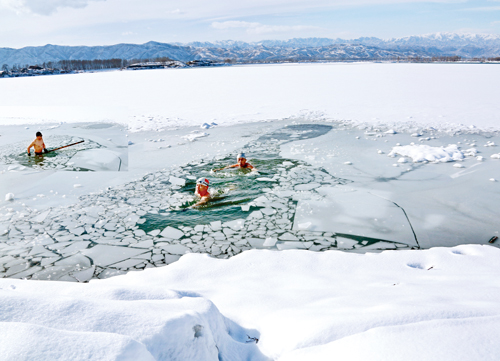 近日,一場大雪覆蓋了忻州大地,這對冬泳愛好者段晉新、王貴民、閆建斌三人來說,更是冬泳的最佳天氣。22日下午,他們來到忻府區(qū)雙乳湖破冰游泳,從中感受冰雪世界的愜意。據(jù)悉,他們是忻州康健游泳俱樂部組織者,從去年冬天開始,他們在雙乳湖堅持冬泳,風(fēng)雪無阻。本報記者 宮愛文 攝