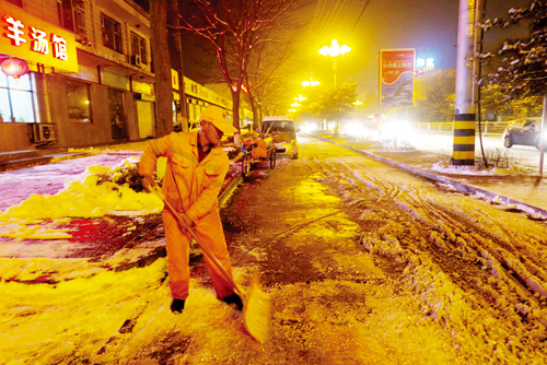 “今天從凌晨三點,所有環(huán)衛(wèi)工全部出動上路掃雪,一般我們是上、下午輪班,但今天大家都是干了一整天,中午吃飯也是輪著去吃的。”環(huán)衛(wèi)工梁順民告訴記者,當(dāng)天正好是他上夜班,要干到晚上十點半?!奥访嫔系姆e雪要加緊清理,不然結(jié)冰了,第二天一早市民上班出行就更不好走了,也不安全。”