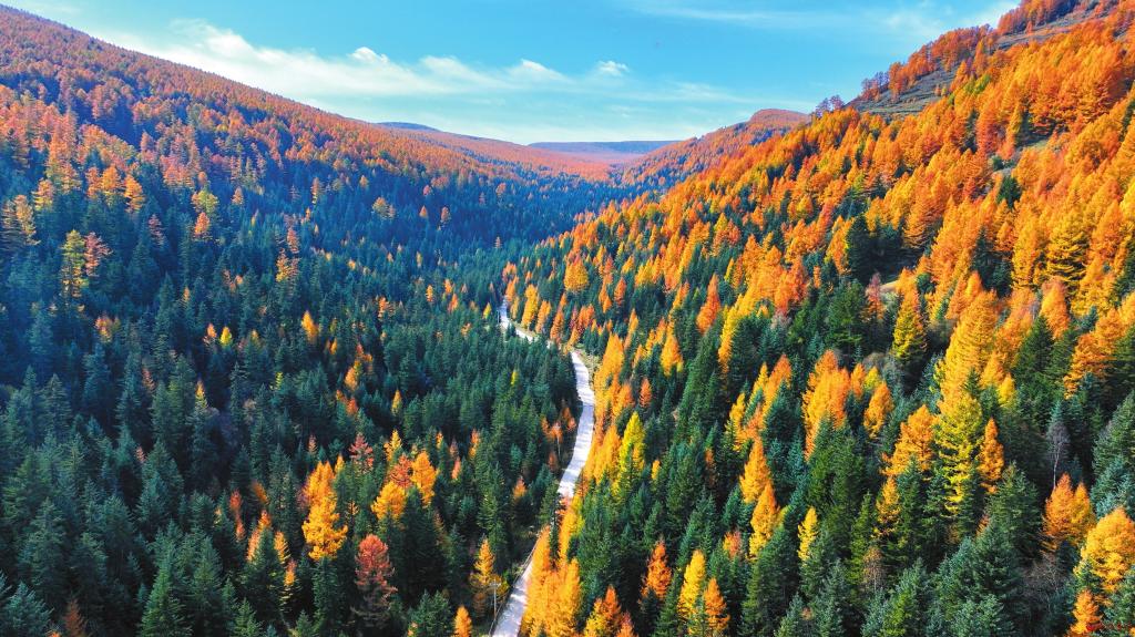 沿著公路,可以看到金色的馳騁、綠色的暢想,還有點綴山間的萬千色彩都在瞬間競相綻放。著色、布局,一切漫不經心,卻是渾然天成。