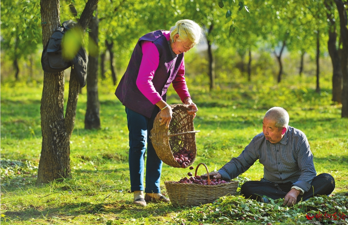 村民在撿棗、篩選、裝袋。