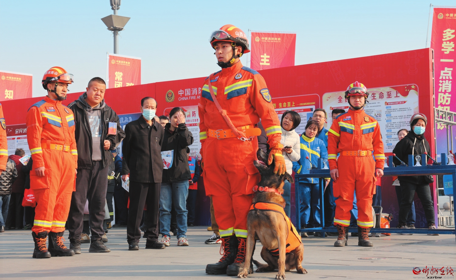 近日,在忻州古城北廣場,消防員正在展示搜救犬訓(xùn)練成果。11月是全國消防宣傳月,我市舉辦了豐富多彩的消防宣傳活動,幫助人們學(xué)習(xí)消防知識,提升安全意識。(記者 范 琛攝