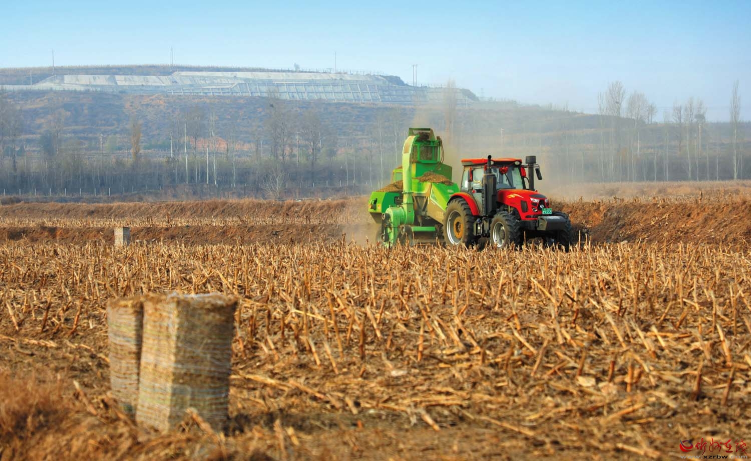 11月19日,原平市大牛店鎮(zhèn)神山二村秋收后的玉米地里,農(nóng)機手駕駛打捆機,正在將玉米秸稈打捆回收。近年來,該市實施秸稈綜合利用行動,不僅有效利用了農(nóng)作物秸稈資源,同時減少了環(huán)境污染。(褚 震攝)