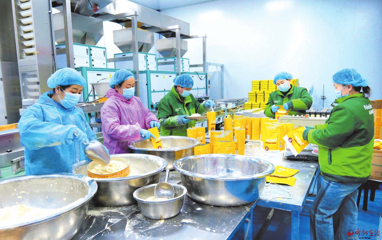 在山西蓮芯硒美農(nóng)業(yè)科技開發(fā)有限公司的生產(chǎn)車間內(nèi),工人們正在緊張有序地將小米面和富硒小米裝袋、封包、運送。他們在各自崗位上辛勤忙碌,鉚足干勁加力生產(chǎn)。