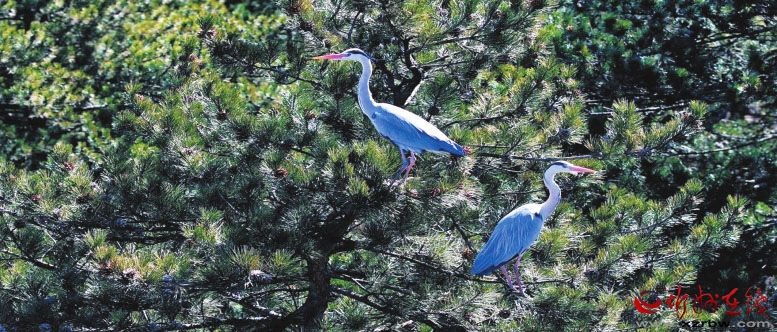 蒼鷺筑巢頗為講究,專挑高大樹木頂端,細(xì)樹枝橫豎交錯搭成盆狀。鎮(zhèn)海寺及周邊有530株樹齡在150—1000年的油松,入選“全國100個最美古樹群”,是蒼鷺理想的棲息地。一年又一年,不斷有雛鳥在“咯咯”的啼叫聲中平安長大,蒼鷺家族由最初的幾只壯大到了現(xiàn)在的上百只。