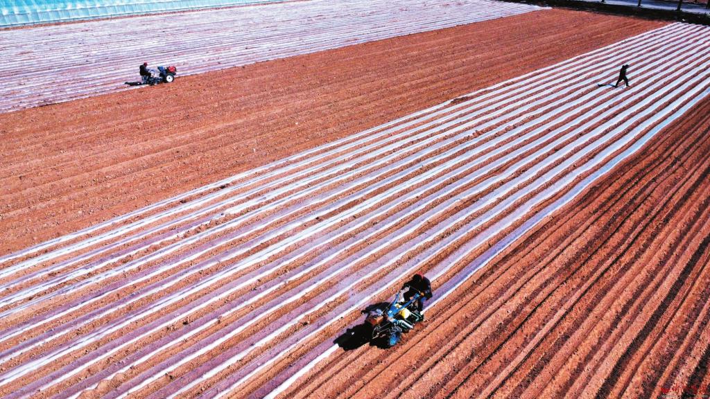 春光明媚農(nóng)事忙,原平市子干鄉(xiāng)田間,農(nóng)民正在覆蓋地膜。連日來,該市搶抓農(nóng)時,全力開展春耕備耕工作,地頭一片忙碌景象。 (褚震 攝)