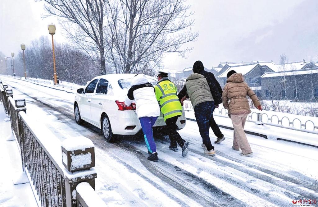 圖為交警與游客合力將受困車輛推移至安全區(qū)域。