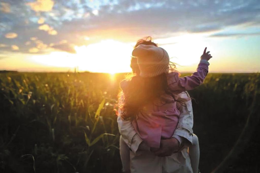 媽媽在晚霞中幸福地哄逗著兒子。梁平攝
