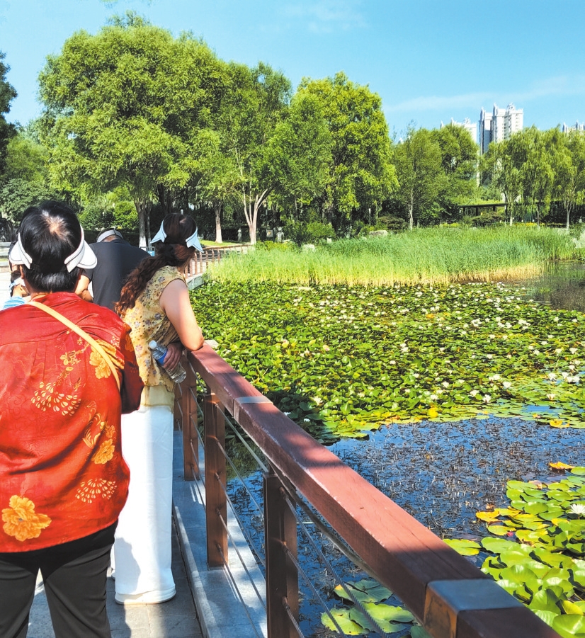 暮色漫上來(lái)時(shí),荷塘最是熱鬧。穿花裙的小娃娃踮腳摸蓮蓬,銀發(fā)的老夫妻坐在石凳上數(shù)花瓣,晚歸的人駐了步,手機(jī)鏡頭里全是荷的身影。風(fēng)推著荷浪輕搖,像在說(shuō):“別急,等你?!?/p>
