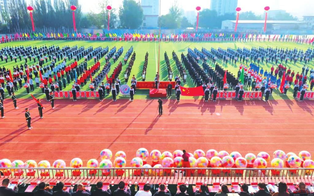 9月28日,原平市范亭中學校運動場上彩旗招展、鼓樂喧天,該市中小學秋季田徑運動會開幕,有小學、初中、高中的38支代表隊共3000余人參加了開幕式。圖為開幕式現(xiàn)場。(吉建平攝)