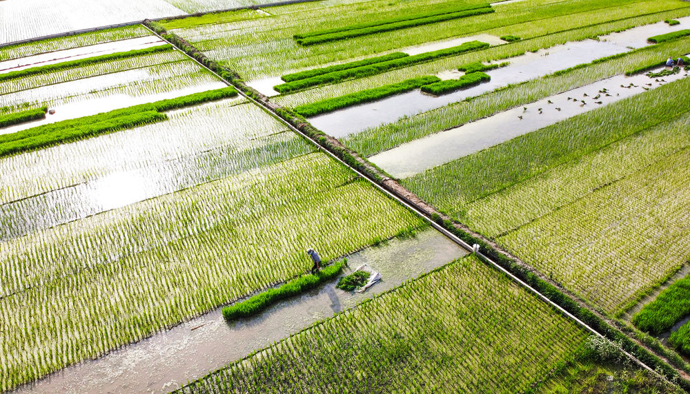 2020年6月14日,農(nóng)民在洛陽市孟津縣會(huì)盟鎮(zhèn)黃河岸邊的萬畝優(yōu)質(zhì)水稻種植示范基地內(nèi)移栽水稻秧苗(無人機(jī)照片)。新華社發(fā)(黃政偉 攝) 飯碗里的中國(guó)好糧