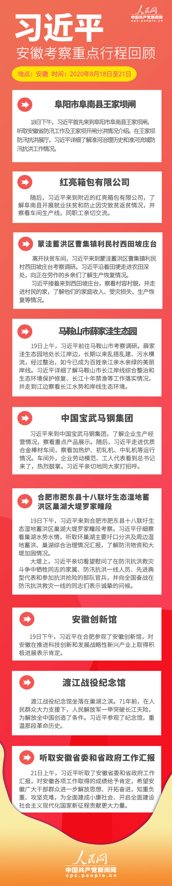 8月18日至21日,習近平來到安徽,看望慰問受災群眾和防汛救災一線人員,就統(tǒng)籌推進常態(tài)化疫情防控和經(jīng)濟社會發(fā)展工作、加強防汛救災和災后恢復重建、推進長三角一體化發(fā)展、謀劃“十四五”時期經(jīng)濟社會發(fā)展進行調(diào)研。