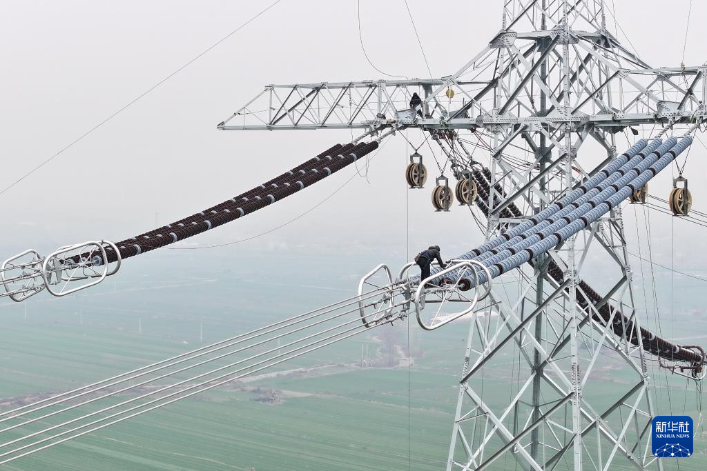 12月10日,工人在河北省磁縣境內(nèi)的隴東至山東800千伏特高壓直流線路工程建設(shè)工地安裝附件(無人機(jī)照片)。(新華社記者 楊世堯 攝)