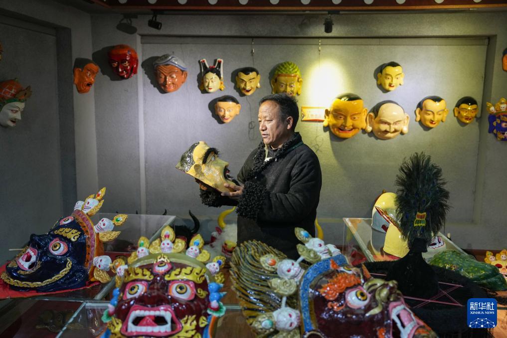 12月9日,西洛在合作社展覽廳查看和同事們一起制作的西藏傳統(tǒng)面具。(新華社記者 丁汀 攝)