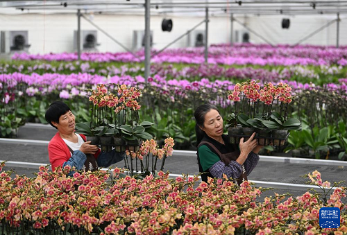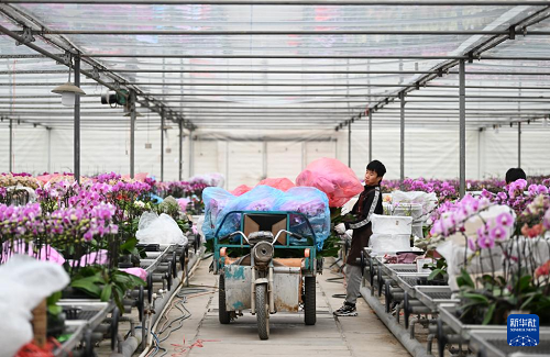 12月19日,花農(nóng)在溫室里搬運(yùn)蝴蝶蘭。(新華社記者 李然 攝)