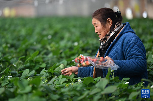 12月19日,農(nóng)戶在大棚里采摘草莓。(新華社記者 李然 攝)