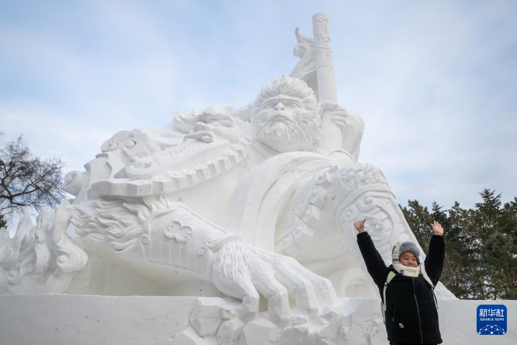 12月23日,一名游客在第37屆太陽島國際雪雕藝術(shù)博覽會上拍照留念。(新華社記者 張濤 攝)