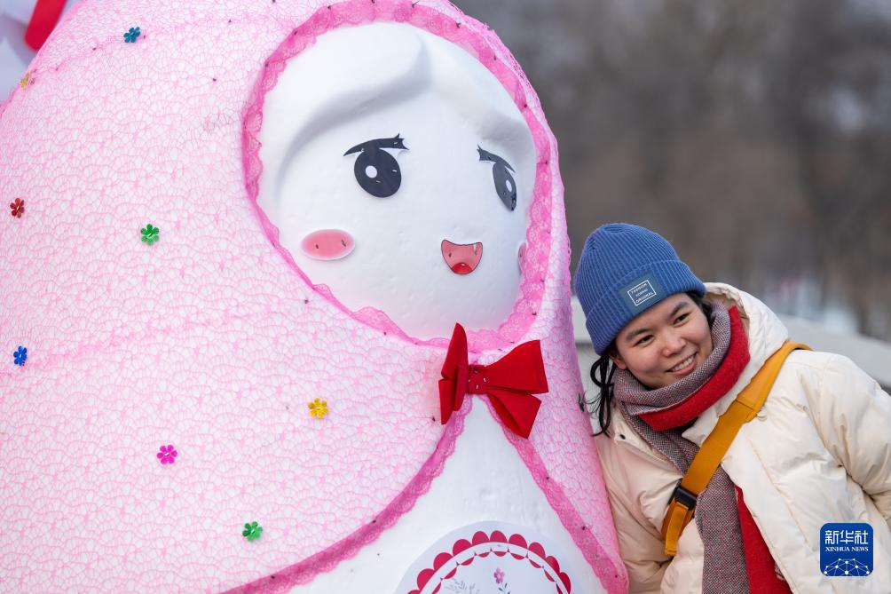 12月23日,一名游客在第37屆太陽島國際雪雕藝術(shù)博覽會上留影。(新華社記者 張濤 攝)