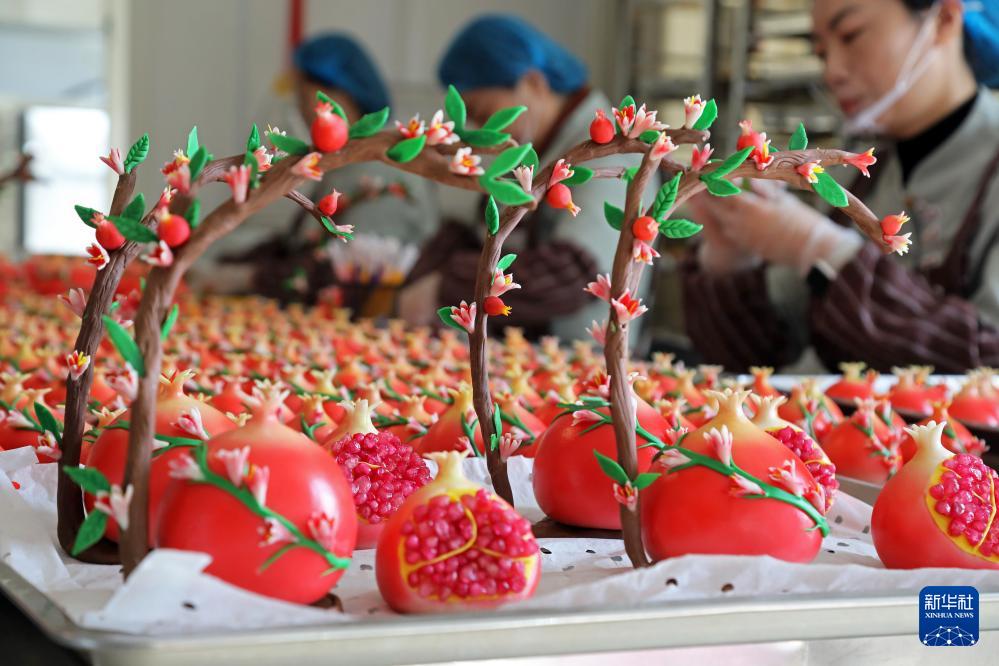 12月29日,民間藝人在山東省棗莊市“紅石榴”喜饃制作工坊捏制“紅石榴”喜饃上的裝飾物。(新華社發(fā) 王海楠 攝)