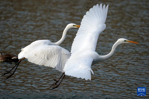 2025年1月1日,白鷺在太原市汾河上飛翔。(新華社記者 詹彥 攝)