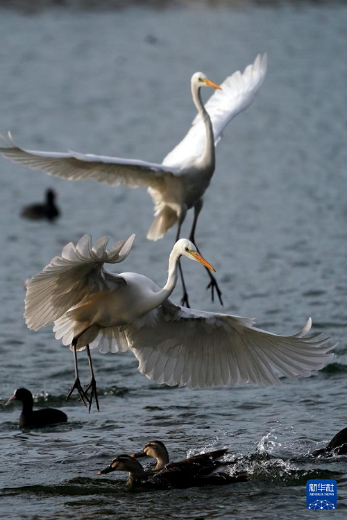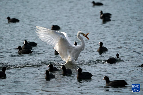 2025年1月1日,白鷺在太原市汾河覓食。(新華社記者 詹彥 攝)