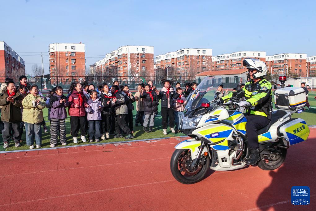 1月9日,山東省棗莊市公安局市中分局交通警察大隊(duì)民警在當(dāng)?shù)匚幕沸W(xué)與學(xué)生互動(dòng)宣傳交通安全知識(shí)。(新華社發(fā) 孫中喆 攝)