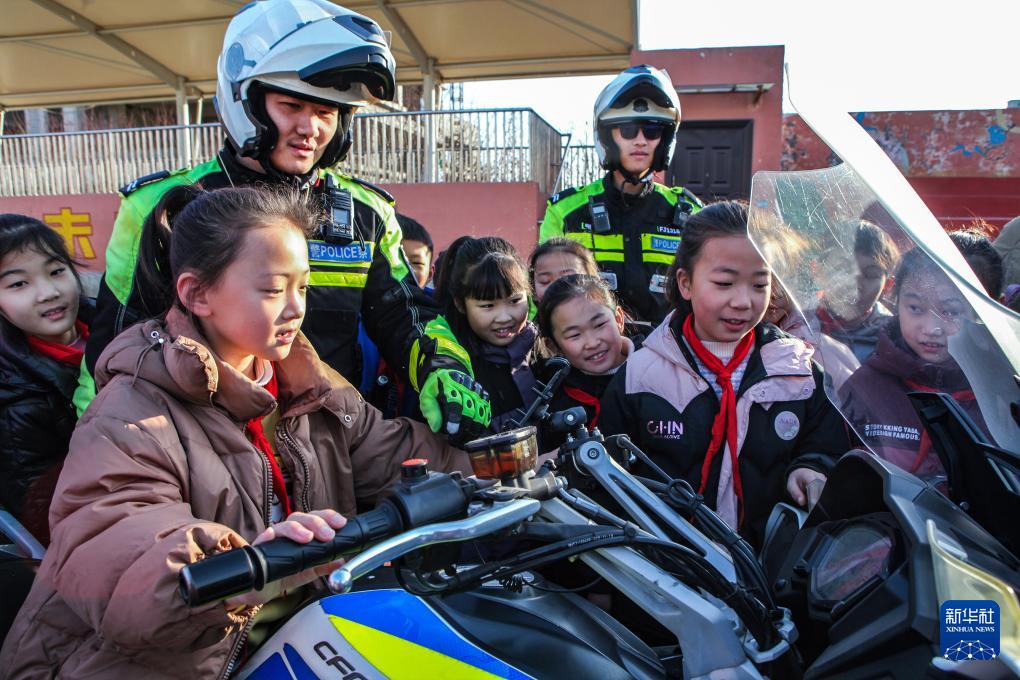 1月9日,在河南省焦作市博愛縣新華小學(xué),同學(xué)們近距離接觸警用摩托車。(新華社發(fā) 程全 攝)