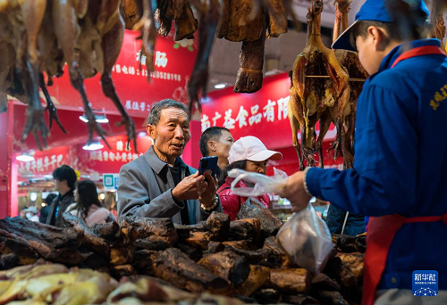 1月14日,顧客在昆明滇池國(guó)際會(huì)展中心購(gòu)買(mǎi)肉類腌制品。(新華社發(fā) 彭奕凱 攝)