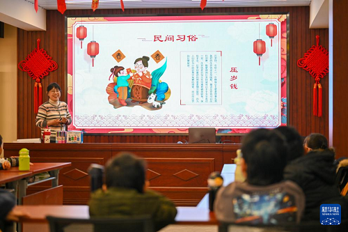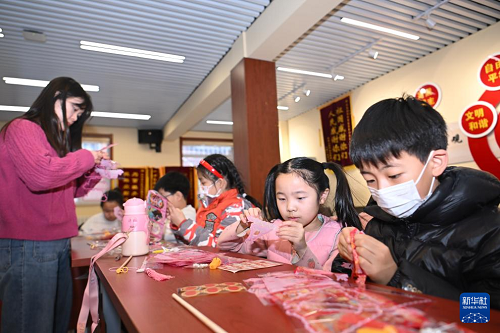 1月16日,在天津市河東區(qū)大王莊街道麟祥里社區(qū)活動室,社區(qū)志愿者帶領小朋友了解春節(jié)民俗。(新華社記者 孫凡越 攝)
