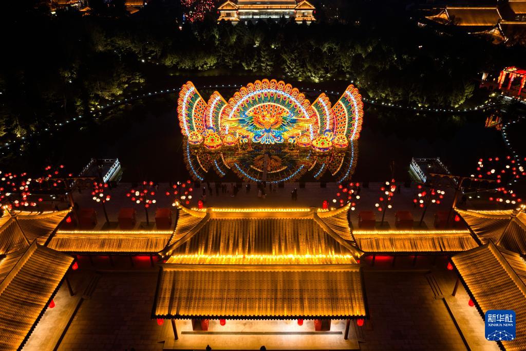 1月22日晚拍攝的西安大唐芙蓉園內(nèi)的巨型彩燈(無人機照片)。(新華社記者 邵瑞 攝)
