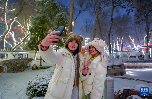 1月24日,游客在寧夏銀川寧園公園拍照留念。(新華社記者 楊植森 攝)