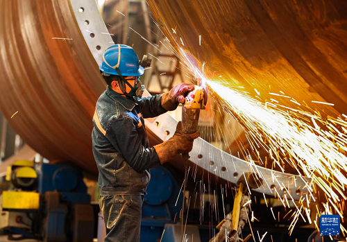 2月5日,江蘇省連云港經(jīng)濟(jì)技術(shù)開發(fā)區(qū)一家風(fēng)力設(shè)備公司工人在車間內(nèi)生產(chǎn)風(fēng)電塔架。(新華社發(fā) 王健民 攝)