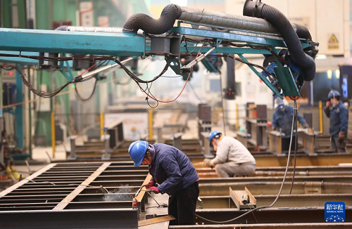 2月5日,山東省滕州市一家鋼結(jié)構(gòu)生產(chǎn)企業(yè)工人在車間內(nèi)工作。(新華社發(fā) 李志軍 攝)