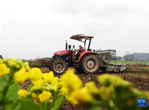 2月7日,在四川省達(dá)州市渠縣臨巴鎮(zhèn)四面村,村民駕駛農(nóng)機(jī)翻田準(zhǔn)備播種玉米。(新華社發(fā) 鄧良奎 攝)