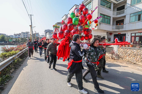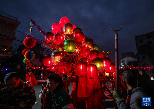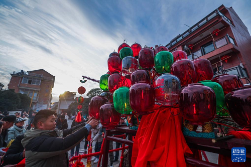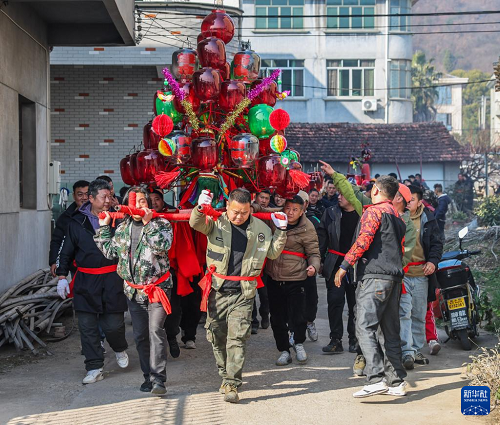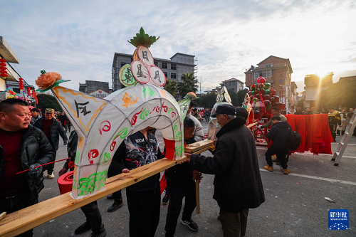 2月10日,赤松鎮(zhèn)虎巖村村民抬著板凳龍在村里巡游。(新華社記者 徐昱 攝)