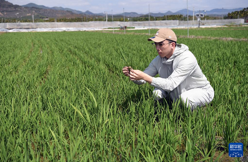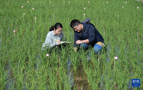 2月10日,在三亞市崖州灣科技城,南京農(nóng)業(yè)大學(xué)三亞研究院科研人員在調(diào)查水稻農(nóng)藝性狀。(新華社記者 趙穎全 攝)