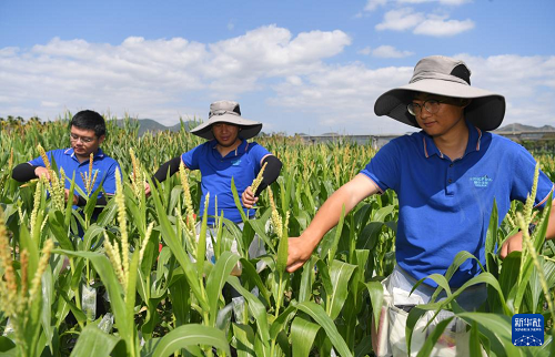 2月10日,在三亞市崖州灣科技城,隆平生物技術(shù)(海南)有限公司的科研人員對(duì)玉米進(jìn)行自交授粉。(新華社記者 趙穎全 攝)
