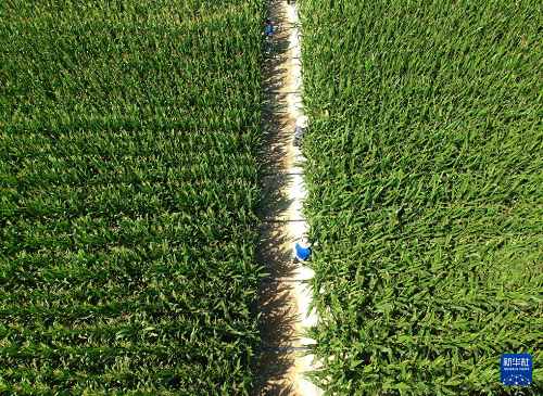 2月10日,在三亞市崖州灣科技城,隆平生物技術(shù)(海南)有限公司的科研人員在科研玉米地里工作(無人機(jī)照片)。(新華社記者 趙穎全 攝)