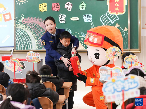 2月13日,消防員在江蘇淮安生態(tài)文化旅游區(qū)沁春路小學(xué)給學(xué)生講解消防安全知識(shí)。(新華社發(fā) 趙啟瑞 攝)