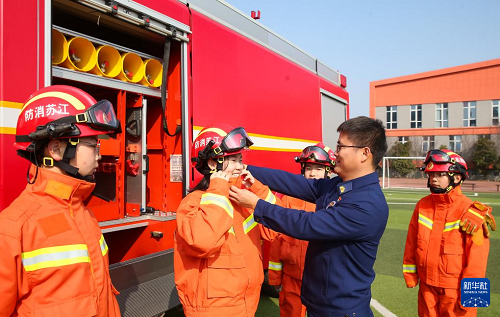 2月13日,在江蘇省句容市葛村中心小學(xué),學(xué)生在消防員的幫助下體驗(yàn)穿戴消防救援服。(新華社發(fā) 鐘學(xué)滿 攝)
