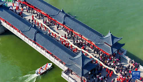 2月13日,民俗文藝表演隊從全椒縣太平橋上經(jīng)過(無人機照片)。(新華社發(fā) 劉玉才 攝)
