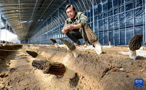 2月19日,北京大興區(qū)龐各莊鎮(zhèn)聚棒羊肚菌農(nóng)場(chǎng)的技術(shù)人員在觀測(cè)羊肚菌長(zhǎng)勢(shì)。(新華社記者 李欣 攝)
