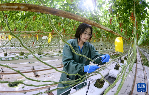 2月19日,技術(shù)人員在宏福農(nóng)業(yè)大興園區(qū)的智能溫室中檢測(cè)智能節(jié)水管道。(新華社記者 李欣 攝)