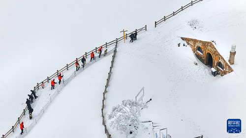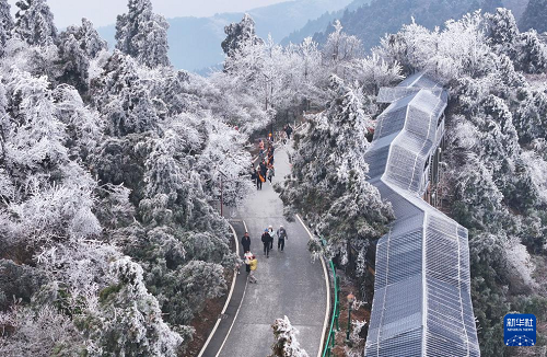 2月24日,游客在湖南省衡陽(yáng)市南岳衡山風(fēng)景區(qū)游玩賞雪(無(wú)人機(jī)照片)。(新華社發(fā) 曹正平 攝)