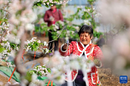 2月25日,山東省棗莊市市中區(qū)齊村鎮(zhèn)前良村農(nóng)民給櫻桃樹人工授粉。(新華社發(fā) 孫中喆 攝)