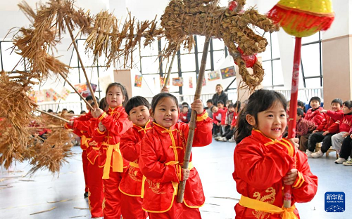 2月27日,浙江省臺州市仙居縣下各鎮(zhèn)中心幼兒園的孩子在老師指導下進行“稻草龍”表演。(新華社發(fā) 王華斌 攝)