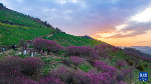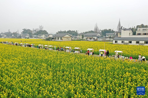 3月1日,游客在四川省眉山市青神縣青竹街道新光村花?!凹小辟?gòu)物(無(wú)人機(jī)照片)。(新華社發(fā) 姚永亮 攝)