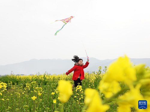 3月1日,小朋友在四川省達(dá)州市開(kāi)江縣普安鎮(zhèn)油菜花田間放風(fēng)箏。(新華社發(fā) 鄧良奎 攝)