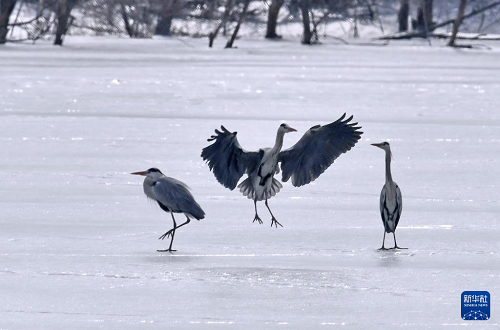 3月4日,蒼鷺在密云水庫未融化的冰面上嬉戲。(新華社記者 李欣 攝)